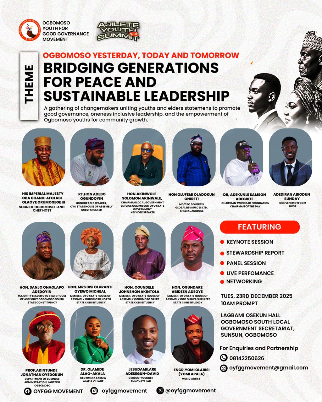 Ogbomoso Youth for Good Governance (OYFGG), an apolitical youth movement convened by Comrade Abiodun Sunday Adediran, recently gathered at Lagbami Osekun Hall for the Ajilete Youth Summit 4.0. The theme was as profound as it was timely: “Ogbomoso Yesterday, Today and Tomorrow: Bridging Generations for Peace and Sustainable Leadership.” The summit was intentionally designed to unite the energy of young people with the wisdom of elder statesmen in pursuit of inclusive and sustainable leadership.