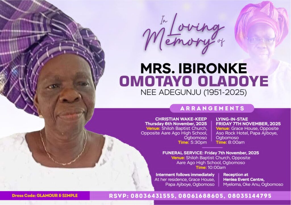 “A devout Christian and committed servant of God, Mama Oladoye lived a life of faith and service to humanity, contributing actively in various capacities within the church, our dearly beloved mother and matiarch of Oladoye family, will be buried on Friday.